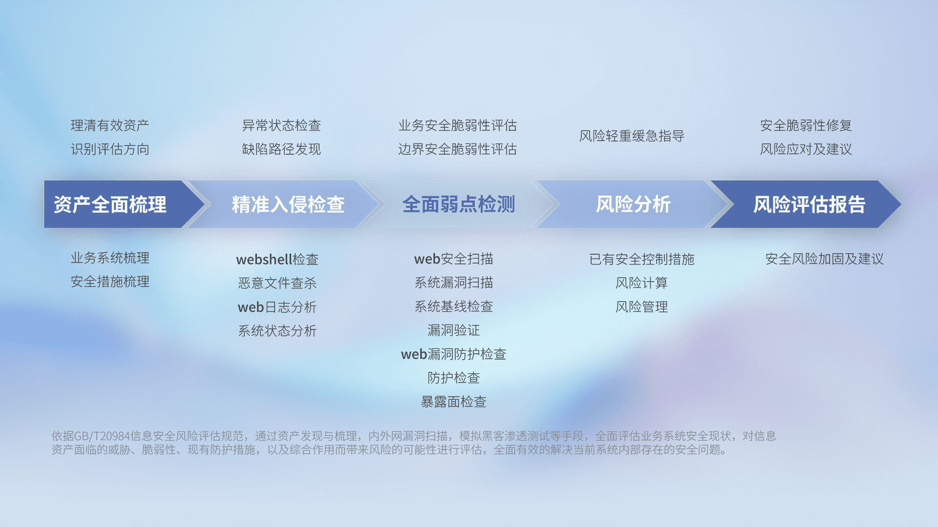 针对客户行业特性,,以专业的安全服务+多厂商联合解决方案提供专属的一站式安全管理服务,,,帮助客户全面感知网络空间威胁,,,基于识别、、检测、、、分析、、防护、、、监测、、、、响应的服务理论模型,,,,从方案咨询、、、集成交付、、评估验证、、优化加固、、、运维运营,,,致力于为客户提供完整的闭环管理式安全服务。。以实战经验为客户打造高抵御风险的安全体系,,,帮助客户发现威胁、、、、对抗威胁、、、、处置威胁,,不断积累安全对抗能力,,持续保障数字化安全。。。